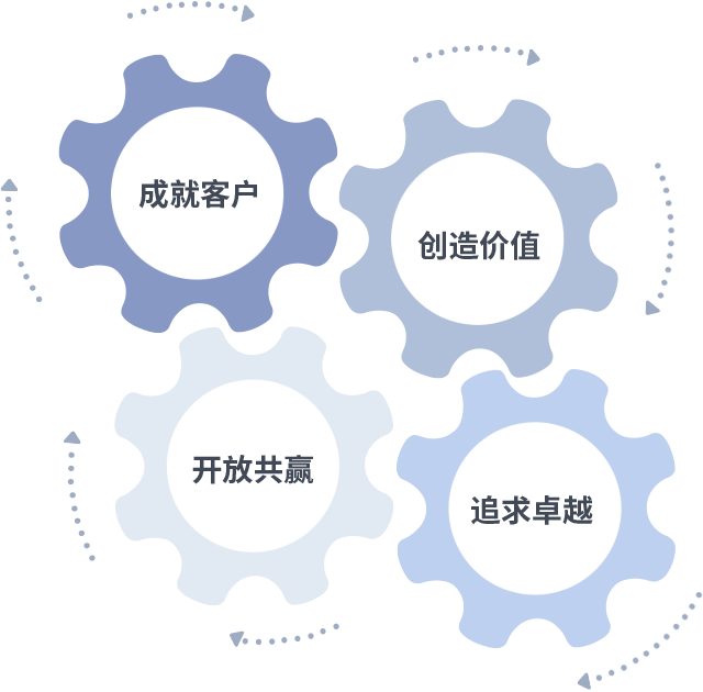 成就客户是一切决策的出发点,创造价值是衡量所有工作的标准,追求卓越是金沙9001cc 以诚为本做事做人的态度,开放共赢是金沙9001cc 以诚为本的格局也是最终的结果。价值观的齿轮环环相扣,推动着组织里的每个人不断向前。